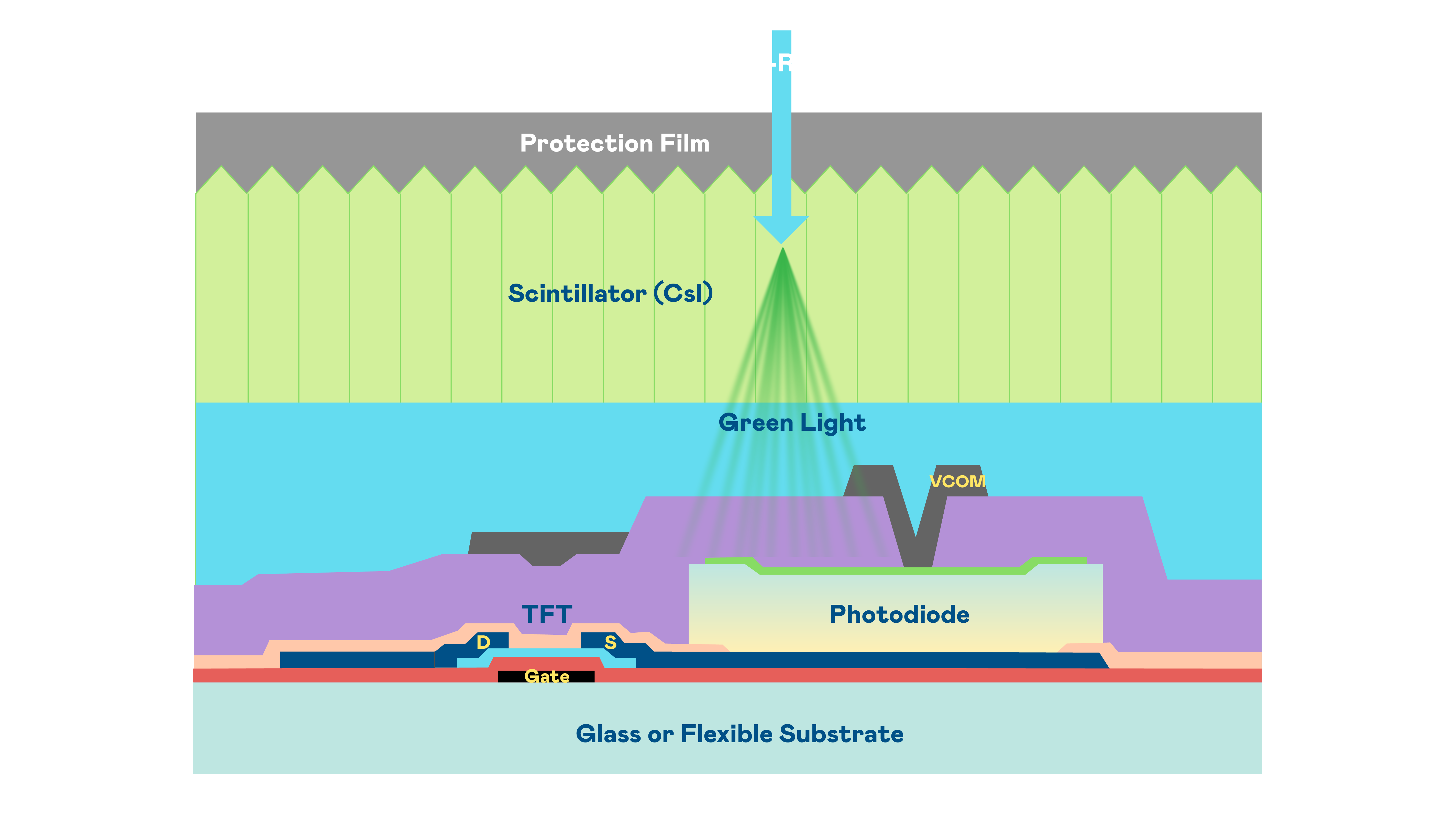 果冻传媒原创的X光影像感測陣列使用薄膜電晶體 (TFT) 作為每個像素的讀取開關,搭配光電二極體(Photodiode)的光電轉換元件,用以感測X光影像訊號。